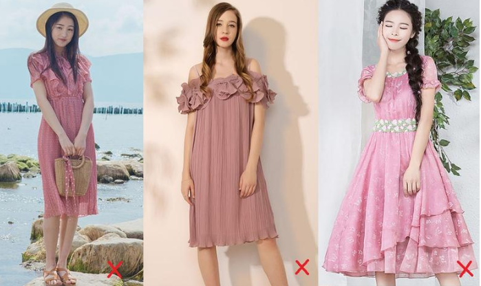 比如层叠荷叶边、蝴蝶结小碎花等,这些设计和元素都带有小复杂感,过于女性的娇柔感,和黄皮会感觉比较不搭。