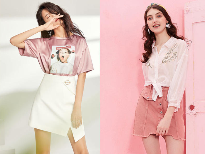 就像上图所示,右侧模特既大范围的展现出粉色的少女感,又通过内里的浅色服饰衬托出肌肤的白皙。比起左侧模特更显靓丽感。