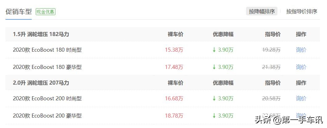不过随着国产车的崛起,以及帕萨特、雅阁等竞品车型的换代,蒙迪欧的竞争力越来越弱。为了稳住销量,不得不采取较大的降幅,用价格来吸引市场上的消费者。近日,我们通过电话的形式,与福特经销商沟通,目前蒙迪欧全系车型的优惠达到了3.9万元。